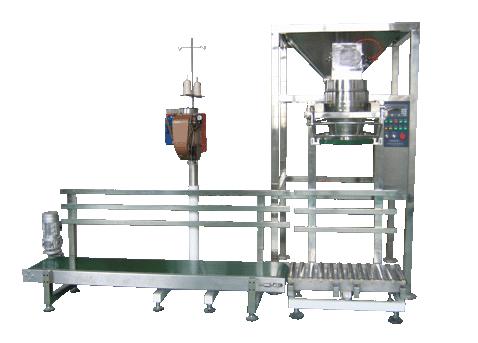 包裝機自動計量、夾袋、充填、封口、縫包、傳送。需人工配合套袋、協助封口,單人可操作。